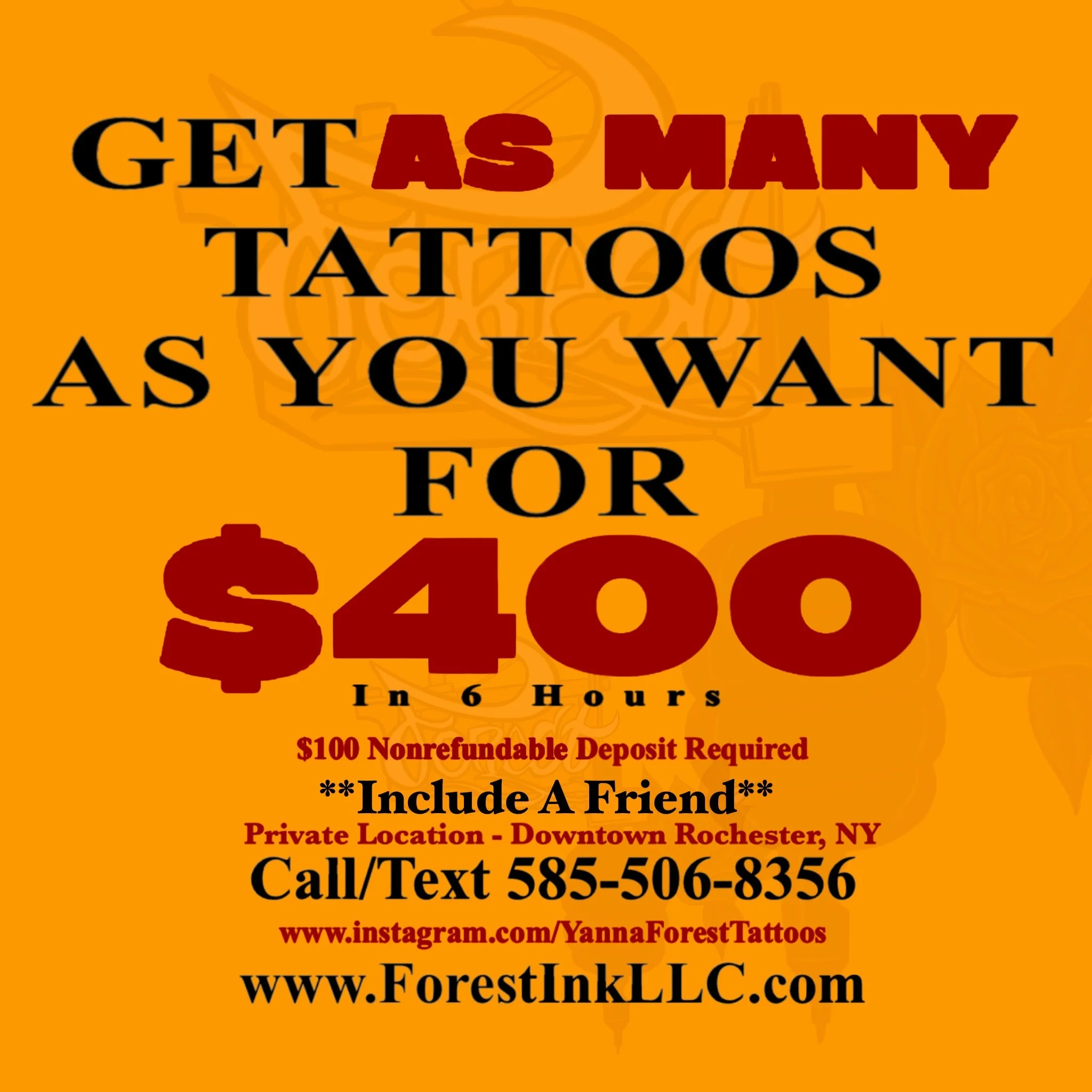For just $400, enjoy up to 6 hours of tattoo time and get as many tattoos as you want in one session. A $100 non-refundable deposit is required to secure your spot, and you can even bring a friend to split the session with. All work is done in a private luxury studio in Downtown Rochester, NY for your comfort and privacy.